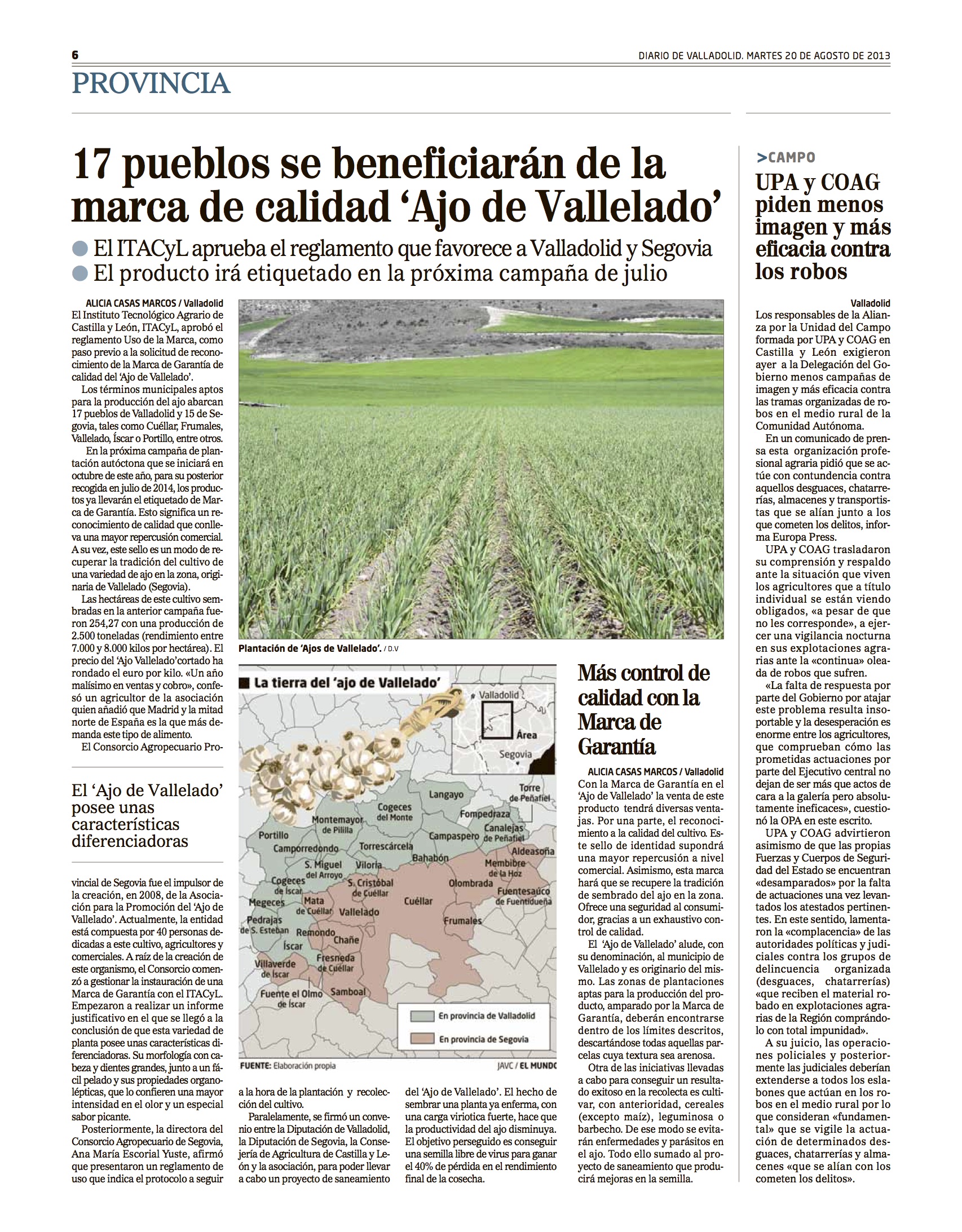 17 pueblos se beneficiarán de la marca de calidad ‘Ajo de Vallelado’ marzo 6, 2015 de Alicia Casas Marcos Deja un comentario Noticia publicada en El Mundo / Diario de Valladolid, el martes 20 de agosto de 2013 Enlace a noticia en PDF Comparte esto: Haz clic para compartir en X (Se abre en una ventana nueva) X Haz clic para compartir en Facebook (Se abre en una ventana nueva) Facebook Me gusta Cargando... Relacionado