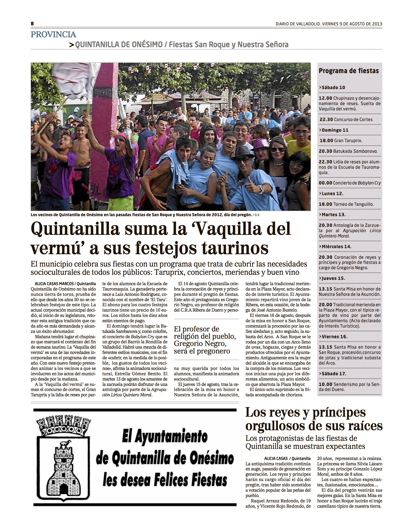 Quintanilla suma la ‘Vaquilla del vermú’ a sus festejos taurinos marzo 6, 2015 de Alicia Casas Marcos Deja un comentario Noticia publicada en El Mundo / Diario de Valladolid, el viernes 9 de agosto de 2013 Enlace a noticia en PDF Comparte esto: Haz clic para compartir en X (Se abre en una ventana nueva) X Haz clic para compartir en Facebook (Se abre en una ventana nueva) Facebook Me gusta Cargando... Relacionado