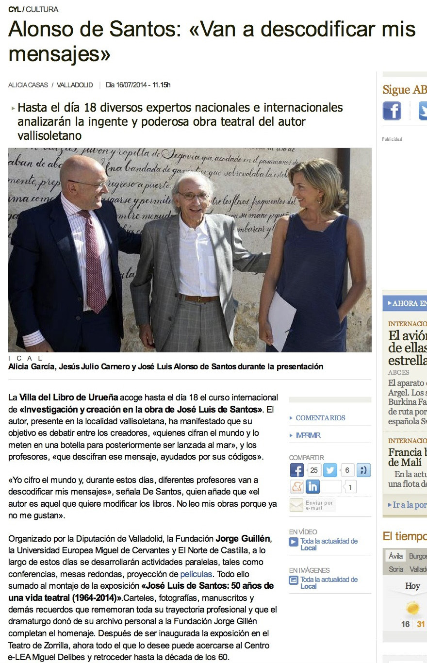Alonso Santos : «Van a descodificar mis mensajes» marzo 12, 2015 de Alicia Casas Marcos Deja un comentario Noticia publicada en ABC.es, el 16 de julio de 2014 Enlace a noticia en abc.es Comparte esto: Haz clic para compartir en X (Se abre en una ventana nueva) X Haz clic para compartir en Facebook (Se abre en una ventana nueva) Facebook Me gusta Cargando... Relacionado