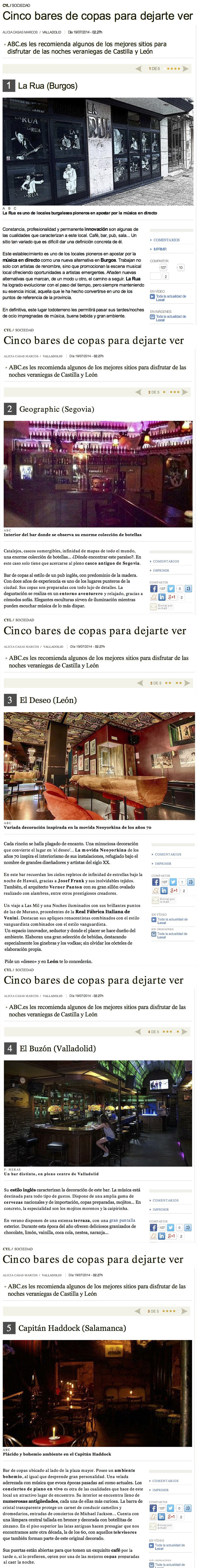 Cinco Bares de copas para dejarte ver marzo 13, 2015 de Alicia Casas Marcos Deja un comentario Noticia publicada en ABC.es, el 19 de julio de 2014 Enlace a mi top 5 de algunos de los mejores bares de copas para que disfruten de las noches veraniegas de Castilla y León en abc.es Comparte esto: Compartir en X (Se abre en una ventana nueva) X Comparte en Facebook (Se abre en una ventana nueva) Facebook Me gusta Cargando... Relacionado