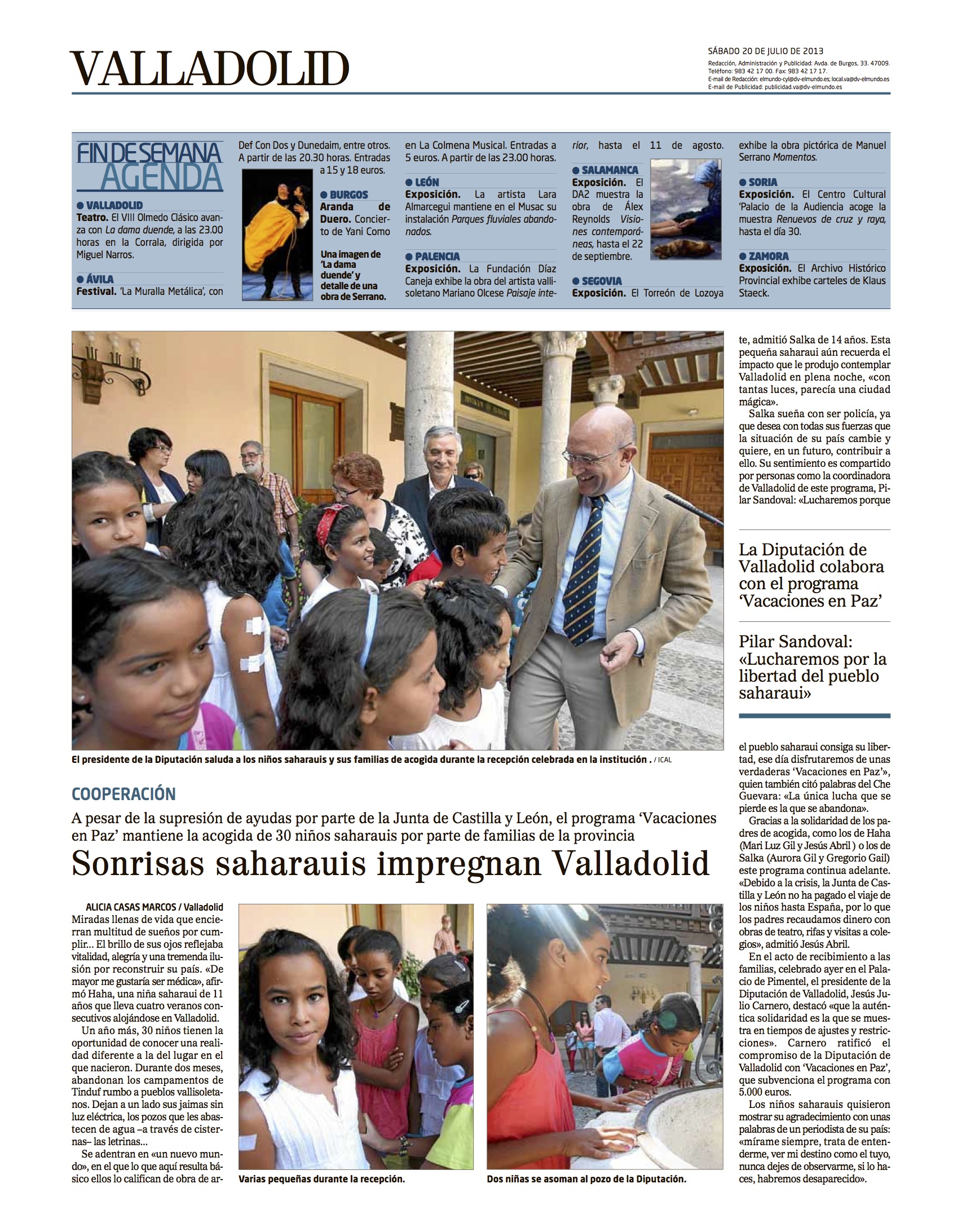 mayo 11, 2014 de Alicia Casas Marcos Deja un comentario Sonrisas saharauis impregnan Valladolid Reportaje publicado en El Mundo / Diario de Valladolid, el sábado 20 de julio de 2013. Enlace a noticia en PDF